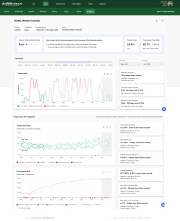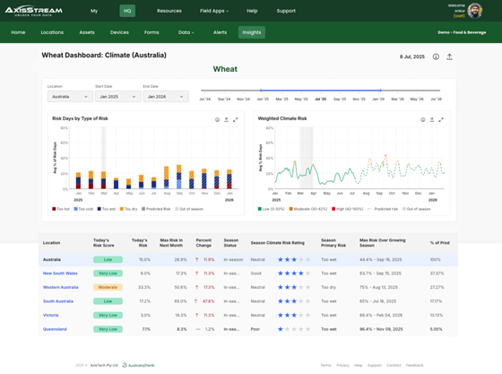 The integration with AxisTech’s data platform, AxisStream, enables at a region, grower and buyer level, delivery of targeted climate and production risk predictions. With an initial focus on cropping, viticulture and horticulture, AxisTech will be bringing this to its user base throughout Australian, SE Asian and Latin American production systems.